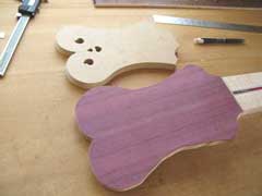 | ヘッド表面に突き板を接着します。(参考:オッキオギターネック加工-04) これは見た目を良くすることもありますが、ヘッドの強度を上げることにも貢献しています。 ビータギタラーズのオッキオ、ミリンジェのヘッドには、このような板が接着されています。 今回はリクエストで、ボディに使った「パープルハート」という木材を使います。 ボディとの統一感を出す為、ボディ材の余りから板を作りました。 <左写真> ボディ材の余りから、板を切り出します。 これをスライスして本の様に開き、中央で接着します。(「ブックマッチ」と言います) バイオリンのボディ裏板、ギブソン・レスポールのボディ表などで見られる、左右の木目が合った板が作れます。 <中写真> スライスした板を、中央で接着中。 こういった板の接着を「はぎ(接ぎ)」合わせと言います。 <右写真> 作った板を平らに成形し、ヘッド表面に、お互いの中心線が合致するよう接着し、一日ほど乾燥させます。 |