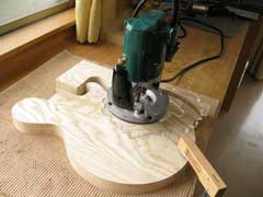| ボリューム、トーンなどのコントロール類(可変抵抗(ポット)、配線など)を収める穴(コントロールキャビティ)を掘ります。 こういった穴の形状などは全て設計の段階で決めておき、都度テンプレートを作って加工します。 <左写真> テンプレートをセットして、ルーターで掘ります。 <中写真> 掘り進んでいる様子。 <右写真> 作業完了。 |